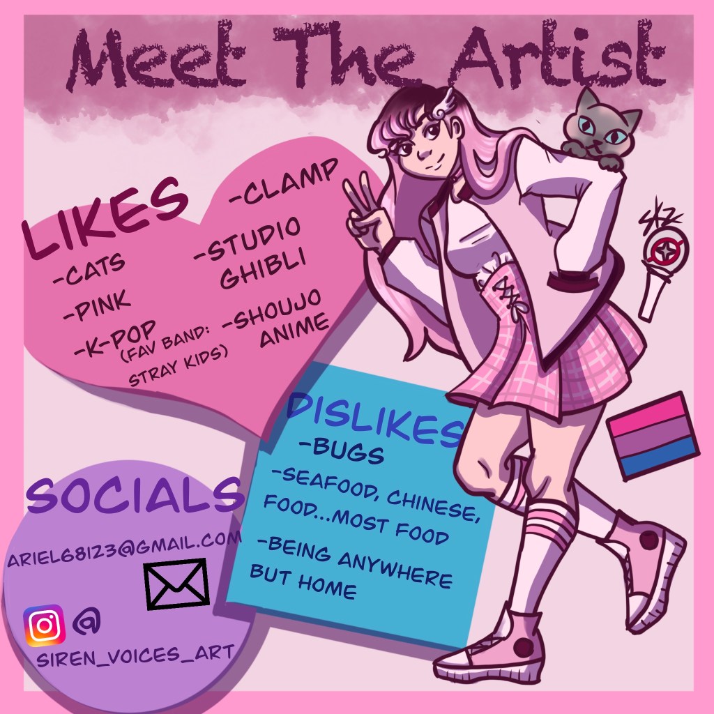 Hi there! My name is Ariel, and I’m a lover of all things pink, cats, and animation. I am a 2D animator, trained at Kennesaw State University, with a passion for character design and concept art. Feel free to contact me with the forum at the bottom of the page or via my socials/email!